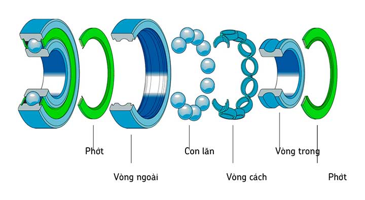 4. Phớt: Có một số loại vòng bi sẽ được bố trí thêm phớt để ngăn chặn mỡ và lưu bụi như bi cầu, bi kim, tang trống... Phớt thường có 2 loại là phớt sắt và phớt nhựa.